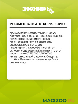 Рекомендации по кормлению: приучайте Вашего питомца к корму постепенно, в течении нескольких дней. Количество съедаемого корма – лакомства зависит от размеров, возраста животного, его индивидуальных особенностей, от условий содержания. Помните, что это корм – лакомство, поэтому он не является основой рациона. Следите, чтобы у Вашего питомца всегда была свежая вода.