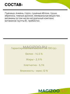 Состав: Пшеница, ячмень, горох, сушеные яблоки, груши, абрикосы, пивные дрожжи, минеральные вещества, витамины (в том числе натуральный комплекс витаминов группы В), пребиотик.