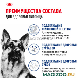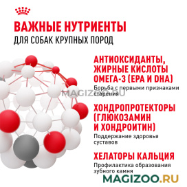- Поддержание жизненной энергии стареющих собак. Специальная формула способствует поддержанию здоровья собак крупных размеров, у которых появились первые признаки старения, а уникальный комплекс антиоксидантов помогает нейтрализовать свободные радикалы.