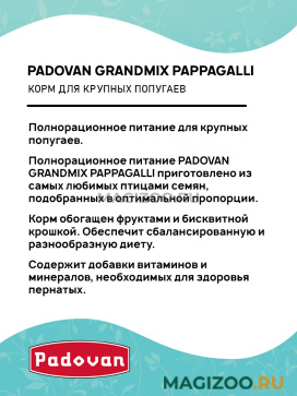 Полнорационное питание PADOVAN GRANDMIX PAPPAGALLI приготовлено из самых любимых птицами семян, подобранных в оптимальной пропорции.