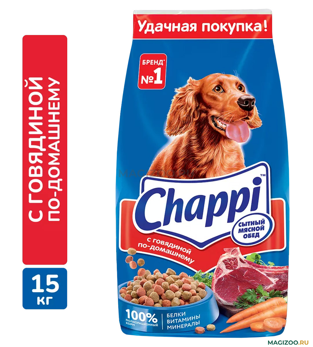 Состав всех кормов данного бренда включает только натуральные составляющие растительного и животного происхождения. Поэтому питание CHAPPI — это грамотно сбалансированный, комплексный рацион, который подойдет собакам любых пород и возрастов!