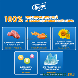 Состав всех кормов данного бренда включает только натуральные составляющие растительного и животного происхождения. Поэтому питание CHAPPI — это грамотно сбалансированный, комплексный рацион, который подойдет собакам любых пород и возрастов!