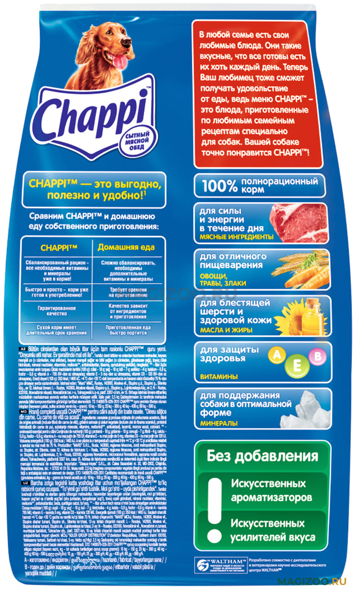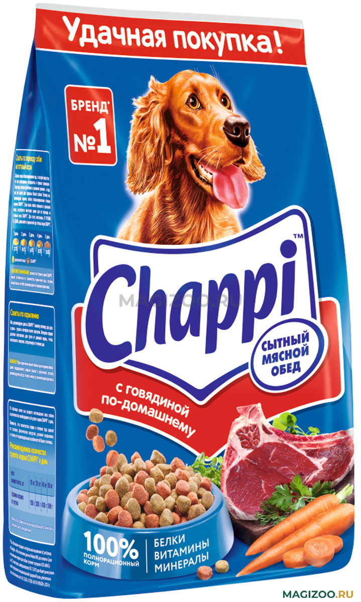 Состав всех кормов данного бренда включает только натуральные составляющие растительного и животного происхождения. Поэтому питание CHAPPI — это грамотно сбалансированный, комплексный рацион, который подойдет собакам любых пород и возрастов!