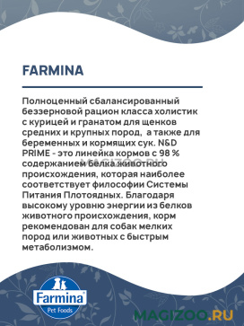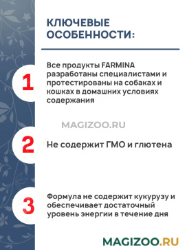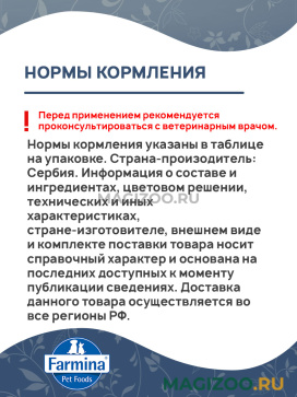 Информация о составе и ингредиентах, цветовом решении, технических и иных характеристиках, стране-изготовителе, внешнем виде и комплекте поставки товара носит справочный характер и основана на последних доступных к моменту публикации сведениях. Доставка данного товара осуществляется во все регионы РФ.Продукция FARMINA является современным стандартом безупречного качества корма. Натуральные компоненты, минеральные вещества, витамины позволяют создавать сбалансированное питание по оптимальной цене. Продукция изготавливается из сырья итальянского, французского и датского производства. FARMINA производит свою продукцию на трех собственных фабриках, которые расположены в трех странах: Италия, Бразилия и Сербия.
