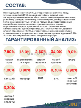 Мясо курицы без костей (26%), дегидратированные белки птицы (курица, индейка) (25%), сладкий картофель, куриный жир, дегидратированные цельные яйца, сельдь, дегидратированная сельдь, рыбий жир (сельди), свиной жир, волокна гороха, дегидратированные белки жвачных животных (ягненок, говядина), дегидратированный свиной белок, сушеная морковь, сушеная люцерна, инулин, фруктоолигосахариды, дрожжевой экстракт (источник маннoолигосахаридов), сушеный гранат (0,5%), сушеные яблоки, сушеный шпинат, подорожник (0,3%), дегидратированный сладкий апельсин, сушеная черника, хлорид натрия, сухие пивные дрожжи, куркумы (0,2%), экстракт алоэ вера глюкозамин, хондроитин сульфат.
