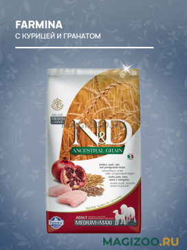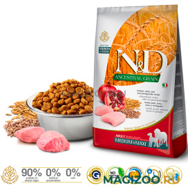 FARMINA N&D ANCESTRAL GRAIN - линейка кормов Farmina, в которой используются неселекционируемые злаки, потребление которых улучшают инсулиновую реакцию и снижают нагрузку на поджелудочную железу.
