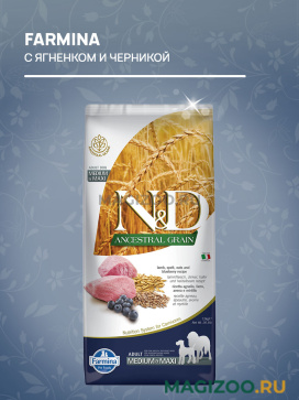 FARMINA N&D ANCESTRAL GRAIN - линейка кормов Farmina, в которой используются неселекционируемые злаки, потребление которых улучшают инсулиновую реакцию и снижают нагрузку на поджелудочную железу.