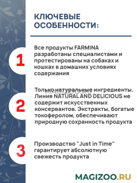 - Все продукты FARMINA разработаны специалистами и протестированы на собаках и кошках в домашних условиях содержания