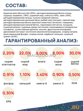 Куриное мясо без костей (25%), дегидратированные белки птицы (курица, индейка) (18%), куриный жир, спельта (10%), овес (10%), дегидратированная сельдь, пульпа сахарной свеклы, дегидратированные цельные яйца, рыбий жир (сельди), свиной жир, дегидратированные белки жвачных животных (ягненок, говядина), дегидратированный свиной белок, гороховая клетчатка, кукуруза, сушеный шпинат, куриные хрящи (источник глюкозамина и хондроитин сульфата), сухие пивные дрожжи, инулин, фруктоолигосахариды, дрожжевой экстракт (источник маннoолигосахаридов), хлорид натрия, моно дикальций фосфат, хлорид калия, карбонат кальция, сушеный гранат (0,5%).