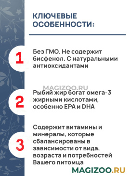 - Содержит витамины и минералы, которые сбалансированы в зависимости от вида, возраста и потребностей Вашего питомца.