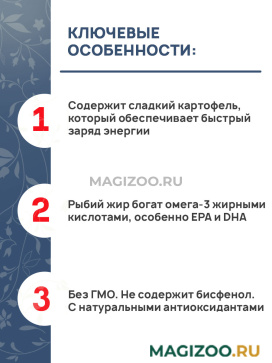 - Содержит сладкий картофель, который обеспечивает быстрый заряд энергии.