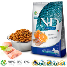 Полноценный сбалансированный беззерновой рацион класса холистик с сельдью и апельсином для взрослых собак мелких пород.