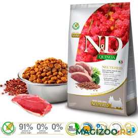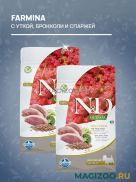 Полнорационный беззерновой корм для кастрированных и стерилизованных взрослых собак маленьких пород с уткой, брокколи и спаржей.