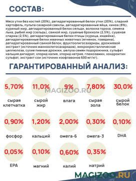 Мясо утки без костей (20%), дегидратированный белок утки (20%), сладкий картофель, пульпа сахарной свеклы, дегидратированные яйца, киноа (8%), куриный жир, дегидратированный белок сельди, волокна гороха, семена льна, рыбий жир (сельдь), свиной жир, сушеные брокколи (2,5%), сушеная спаржа (2,5%), дегидратированные белки птицы (курица, индейка), дегидратированные белки жвачных животных (ягненок, говядина), дегидратированный свиной белок, фруктоолигосахариды, дрожжевой экстракт (источник маннoолигосахаридов), микрокристаллическая целлюлоза, сухие пивные дрожжи, шелуха семян подорожника, сульфат кальция дигидрат, хлорид калия, хлорид натрия, глюкозамин, хондроитин сульфат, экстракт сои (источник изофлавонов 600 мг/кг).
