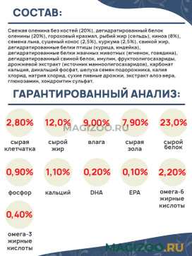 Свежая оленина без костей (20%), дегидратированный белок оленины (20%), гороховый крахмал, рыбий жир (сельдь), киноа (8%), семена льна, сушеный кокос (2,5%), куркума (2,5%), свиной жир, дегидратированные белки птицы (курица, индейка), дегидратированные белки жвачных животных (ягненок, говядина), дегидратированный свиной белок, инулин, фруктоолигосахариды, дрожжевой экстракт (источник манноолигосахаридов), карбонат кальция, дикальций фосфат, шелуха семян подорожника, калия хлорид, натрия хлорид, сухие пивные дрожжи, экстракт алоэ вера, глюкозамин, хондроитин сульфат.