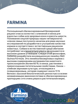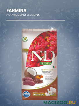 FARMINA DOG N&D GRAIN FREE QUINOA SKIN & COAT VENISON – уникальная формула для чувствительного пищеварения, полезная для восстановления и поддержания здоровья кожи и шерсти.