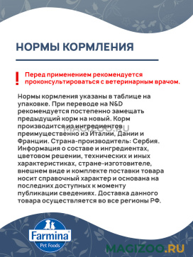 Рекомендации по кормлению: Нормы кормления указаны в таблице на упаковке. При переводе на N&D рекомендуется постепенно замещать предыдущий корм на новый. Корм производится из ингредиентов преимущественно из Италии, Дании и Франции.