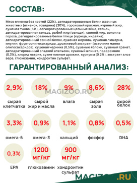 Мясо ягненка без костей (22%), дегидратированные белки жвачных животных (ягненок, говядина) (20%), гороховый крахмал, куриный жир, сушеная тыква (5%), дегидратированные цельные яйца, сельдь, дегидратированная сельдь, рыбий жир (сельди), свиной жир, волокна гороха, дегидратированные белки птицы (курица, индейка), дегидратированный свиной белок, сушеная морковь, сушеная люцерна, инулин, фруктоолигосахариды, дрожжевой экстракт (источник маннoолигосахаридов), сушеная черника (0,5%), сушеные яблоки, сушеный гранат, дегидратированный сладкий апельсин, сушеный шпинат, подорожник (0,3%), хлорид натрия, сухие пивные дрожжи, куркумы (0,2%), экстракт алоэ вера, глюкозамин, хондроитин сульфат.