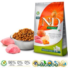 Понимание хищной природы наших четвероногих членов семьи послужило началом для ряда научных исследований по разработке и улучшению качества кормов, в соответствии с естественным рационом животных. Собаки в естественной среде обитания потребляют исключительно мясо и не нуждаются в высоком уровне углеводов. Следуя этой философии, FARMINA разработала инновационную линейку N&D Pumpkin Formula. Это линейка беззерновых кормов с высоким содержанием ингредиентов животного происхождения (более 60 %) и тыквой, овощем с превосходными питательными свойствами.