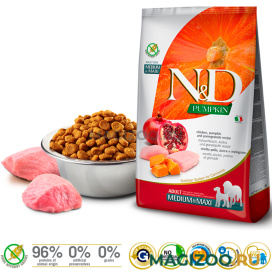 Полноценный сбалансированный беззерновой рацион класса холистик для взрослых собак средних и крупных пород с курицей, тыквой и гранатом.