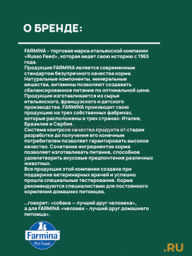 - Все продукты FARMINA разработаны специалистами и протестированы на собаках и кошках в домашних условиях содержания
