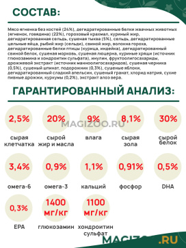 Мясо ягненка без костей (24%), дегидратированные белки жвачных животных (ягненок, говядина) (22%), гороховый крахмал, куриный жир, дегидратированная сельдь, сушеная тыква (5%), сельдь, дегидратированные цельные яйца, рыбий жир (сельди), свиной жир, волокна гороха, дегидратированные белки птицы (курица, индейка), дегидратированный свиной белок, сушеная морковь, сушеная люцерна, куриные хрящи (источник глюкозамина и хондроитин сульфата), инулин, фруктоолигосахариды, дрожжевой экстракт (источник маннoолигосахаридов), сушеная черника (0,5%), сушеный шпинат, подорожник (0,3%), сушеные яблоки, дегидратированный сладкий апельсин, сушеный гранат, хлорид натрия, сухие пивные дрожжи, куркумы (0,2%), экстракт алоэ вера.