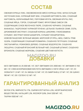Состав: Свежее мясо курицы, обезвоженное мясо курицы, куриный жир, сохраненный при помощи смеси токоферолов (источник витамина Е), мука из мяса сельди (источник DHA), сладкий картофель, коричневый рис, специально обработанные ядра ячменя и овса, рис, сушеный картофель, дегидрированное яйцо, сушеная мякоть томата, сушеная мякоть свеклы, натуральный куриный ароматизатор, сушеная мякоть яблок, рисовые отруби, просо, цельное льняное семя, лецитин, хлорид калия, холин хлорид, соль, таурин, кальция карбонат, дрожжевой экстракт, сульфат железа, сушеный корень цикория (источник инулина), аскорбиновая кислота (витамин С), мелкие креветки и панцирь краба, оксид цинка, экстракт Юкки Шидигера, сушеная голубика, сушеный ананас, ацетат альфа-токоферола (источник витамина Е), витамин РР, селенит натрия, пиридоксин гидрохлорид (витамин В6), Новозеландские зеленые мидии, трепанг, мед, органический сушеный розмарин, сушеная петрушка, органические сушеные листья мяты, органические сушеные бурые водоросли, органическая сушеная люцерна, органический экстракт зеленого чая, органический сушеный шпинат, органическая сушеная брокколи, органическая сушеная морковь, органическая сушеная цветная капуста, рожковое дерево, витамины и минералы.