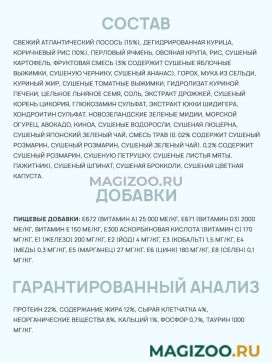 Состав: Свежее мясо атлантического лосося, обезвоженное мясо курицы, коричневый рис, сушеный картофель, специально обработанные ядра ячменя и овса, рис, куриный жир , сохраненный при помощи смеси токоферолов (источник витамина Е), мука из мяса сельди(источник DHA), сухое яблочное пюре, сушеная мякоть томата, сушеная мякоть свеклы, рисовые отруби, просо, цельное льняное семя, лецитин, хлорид калия, холин хлорид, соль, таурин, кальция карбонат, дрожжевой экстракт, сульфат железа, сушеный корень цикория (источник инулина), аскорбиновая кислота (витамин С), оксид цинка, ацетат альфа-токоферола (источник витамина Е), мелкие креветки и панцирь краба, экстракт Юкки Шидигера, сушеная голубика, сушеный ананас, витамин РР, селенит натрия, пиридоксин гидрохлорид (витамин В6), новозеландские зеленые мидии, трепанг, авокадо,органическая лебеда, органический сушеные бурые водоросли, органическая сушеная люцерна, экстракт органического зеленого чая, органический сушеный розмарин, органическая сушеная петрушка, органический сушеные листья мяты , органический сушеный пажитник греческий, органический сушеный шпинат, органическая сушеная брокколи, органическая сушеная цветная капуста, витамины и минералы.