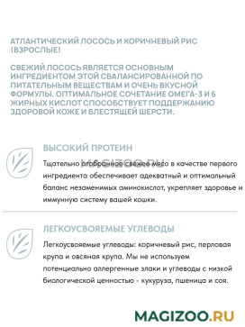 Полноценный сбалансированный рацион класса холистик с лососем и коричневым рисом для здоровья кожи и красоты шерсти взрослых собак всех пород.
