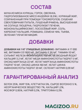Мука из мяса курицы, горох, овсянка, гидролизованное мясо индейки (8,5%), куриный жир, сохраненный при помощи токоферолов, сушеная свекловичная пульпа, лущеный ячмень, высушенная на солнце люцерна, гидролизат печени, монокальцийфосфат, лососёвый жир, соль, карбонат кальция, ромашка, семена чиа, тыква, зеленая губчатая мидия.
