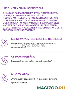 Специально разработанная сбалансированная формула PRONATURE LIFE CHILL HARMONY + с индейкой оптимально поддерживает физическую и психическую форму Вашего питомца: