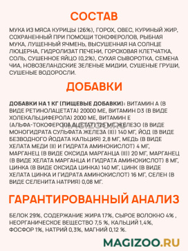Мука из мяса курицы (26%), горох, овес, куриный жир, рыбная мука, лущенный ячмень, высушенная на солнце люцерна, гидролизат печени, гороховая клетчатка, соль, сушенное яйцо (0,2%), сухая сыворотка, семена чиа, новозеландские зеленые мидии, сушеные груши, сушеные водоросли.