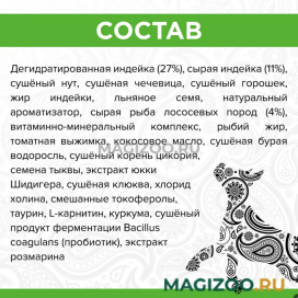 Дегидратированная индейка – 27 %, сырая индейка – 11 %, сушеный нут, сушеная чечевица, сушеный горошек, жир индейки, льняное семя, натуральный ароматизатор, сырая рыба лососевых пород – 4%, витаминно-минеральный комплекс, рыбий жир, томатная выжимка, кокосовое масло, сушеная бурая водоросль, сушеный корень цикория, семена тыквы, экстракт юкки Шидигера, сушеная клюква, хлорид холина, смешанные токоферолы, таурин, L-карнитин, куркума, сушёный продукт ферментации Bacillus coagulans (пробиотик), экстракт розмарина.