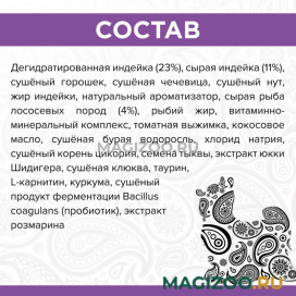 Дегидратированная индейка – 23 %, сырая индейка – 11 %, сушеный горошек, сушеная чечевица, сушеный нут, жир индейки, натуральный ароматизатор, сырая рыба лососевых пород – 4%, рыбий жир, витаминно-минеральный комплекс, томатная выжимка, кокосовое масло, сушеная бурая водоросль, хлорид натрия, сушеный корень цикория, семена тыквы, экстракт юкки Шидигера, сушеная клюква, таурин, L-карнитин, куркума, сушёный продукт ферментации Bacillus coagulans (пробиотик), экстракт розмарина.