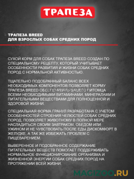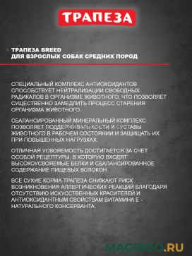 Сухой корм для собак ТРАПЕЗА BREED создан по специальному рецепту, который учитывает особенности развития и жизни собак средних пород с нормальной активностью.