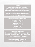 Пшеница цельнозерновая, мука мясная, пульпа свекольная, масло кукурузное, печень гидролизованная, жир животный, комплекс витаминов и минералов, дрожжи, экстракт розмарина, антиоксидант.