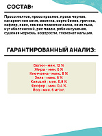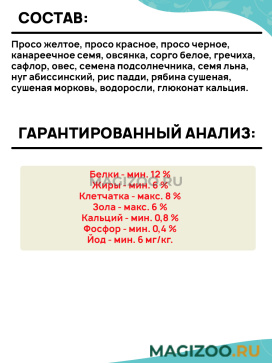 Просо желтое, просо красное, просо черное, канареечное семя, овсянка, сорго белое, гречиха, сафлор, овес, семена подсолнечника, семя льна, нуг абиссинский, рис падди, рябина сушеная, сушеная морковь, водоросли, глюконат кальция.