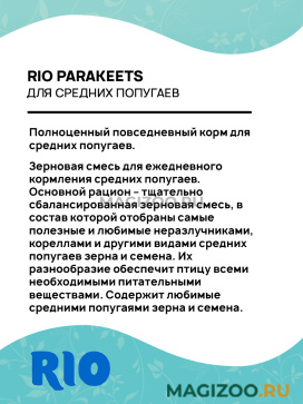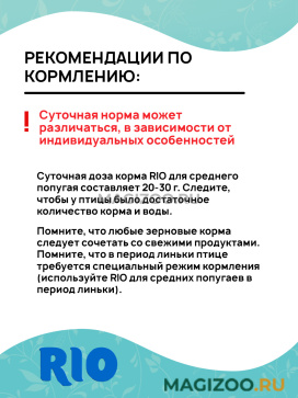 Помните, что любые зерновые корма следует сочетать со свежими продуктами. Помните, что в период линьки птице требуется специальный режим кормления (используйте RIO для средних попугаев в период линьки).