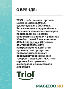 TRIOL – собственная торговая марка компании AMMA, существующая с 2004 года. Являясь одним из крупнейших в России поставщиков зоотоваров, произведенных на самых современных заводах и фабриках Юго-Восточной Азии, компания AMMA с более чем 20-летним опытом деятельности контролирует каждый этап производства продукции. Благодаря постоянному совершенствованию линии товаров, продукция TRIOL – это огромный ассортимент аксессуаров и лакомств для животных!
