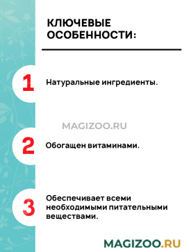 Эта универсальная смесь натуральных природных компонентов содержит все питательные вещества, витамины и минералы, необходимые для роста и развития Вашего питомца.