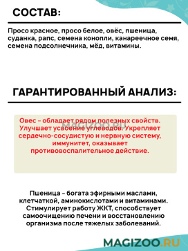 Просо красное, просо белое, овёс, пшеница, суданка, рапс, семена конопли, канареечное семя, семена подсолнечника, мёд, витамины.