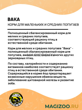 Корм для мелких и средних попугаев "Вака" - полноценный сбалансированный корм для попугаев, амадин всех видов и многих других зерноядных птиц.