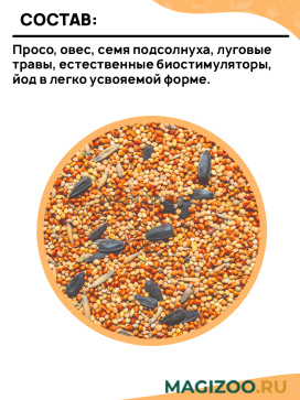 Просо, овес, семя подсолнуха, луговые травы, естественные биостимуляторы, йод в легко усвояемой форме.