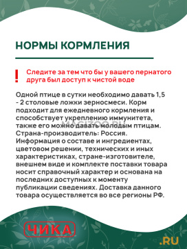 Рекомендации по кормлению: одной птице в сутки необходимо давать 1,5 - 2 столовые ложки зерносмеси. Корм подходит для ежедневного кормления и способствует укреплению иммунитета, также его можно давать молодым птицам.