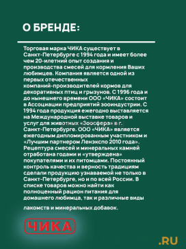Информация о составе и ингредиентах, цветовом решении, технических и иных характеристиках, стране-изготовителе, внешнем виде и комплекте поставки товара носит справочный характер и основана на последних доступных к моменту публикации сведениях. Доставка данного товара осуществляется во все регионы РФ.Рецептура смесей и минеральных камней отработана годами и «утверждена» покупателями и их питомцами. Постоянный контроль качества и верность традициям сделали продукцию узнаваемой не только в Санкт-Петербурге, но и по всей России. В списке товаров можно найти как полноценный рацион питания для домашнего любимца, так и различные виды лакомств и минеральных добавок.
