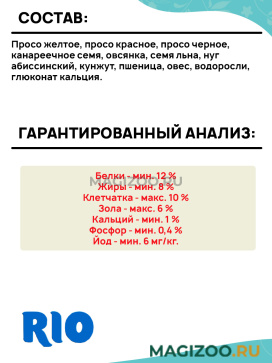 Информация о составе и ингредиентах, цветовом решении, технических и иных характеристиках, стране-изготовителе, внешнем виде и комплекте поставки товара носит справочный характер и основана на последних доступных к моменту публикации сведениях. Доставка данного товара осуществляется во все регионы РФ.Продукция бренда RIO – это 100% натуральные продукты питания и товары для ухода за птицами, которые разработаны с учетом индивидуальных особенностей, пищевых потребностей и вкусовых предпочтений пернатых питомцев. В состав продуктов RIO входят самые лучшие зерна, семена, фрукты, орехи, овощи и редкие плоды.
