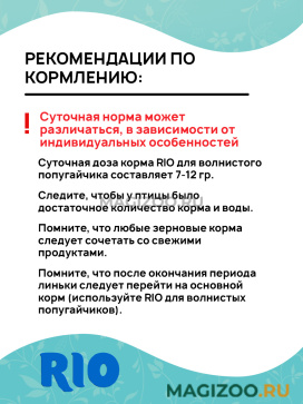 Суточная доза корма RIO для волнистого попугайчика составляет 7-12 гр.