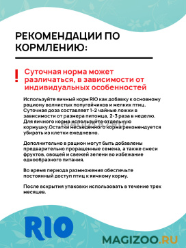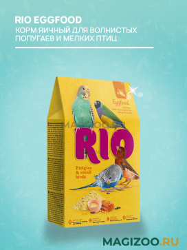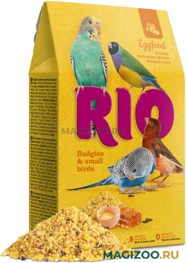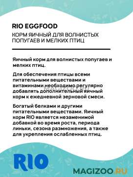 - Богатый белками и другими питательными веществами. Яичный корм RIO является незаменимой добавкой во время роста, периода линьки, сезона размножения, а также для укрепления ослабленных птиц.