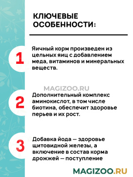 - Яичный корм произведен из цельных яиц с добавлением меда, витаминов и минеральных веществ.