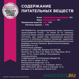 Информация о составе и ингредиентах, цветовом решении, технических и иных характеристиках, стране-изготовителе, внешнем виде и комплекте поставки товара носит справочный характер и основана на последних доступных к моменту публикации сведениях. Доставка данного товара осуществляется во все регионы РФ.В 1969 году основатель компании Пол Аймс создал новый продукт — корм для собак. Качество корма было очень высоким, и он хотел, чтобы его название отражало это, но в то же время было необычным и максимально запоминающимся. Именно тогда Пол Аймс остановил свой выбор на слове EUKANUBA («превосходный», «наилучший»). И он не прогадал! Именно оно стало началом истории компании и залогом ее успеха.
